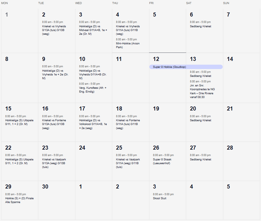 Besoek gerus ons interaktiewe kalender deur hier onder te kliek, jy kan die kalender op jou foon byvoeg deur onder op die subscribe knoppie te kliek en jou toepas van keuse te kies.